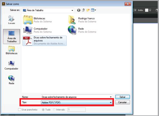 Em seguida, selecione o "Tipo" de arquivo para “Adobe PDF” e clique em "Salvar".