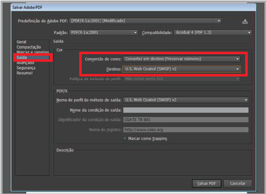 Nesta janela, selecione a “Predefinição de Adobe PDF" para "PDF/X-1a:2001"