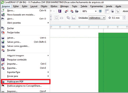 Após finalizar sua arte, vá em "Arquivo" e em seguida "Publicar em PDF"
