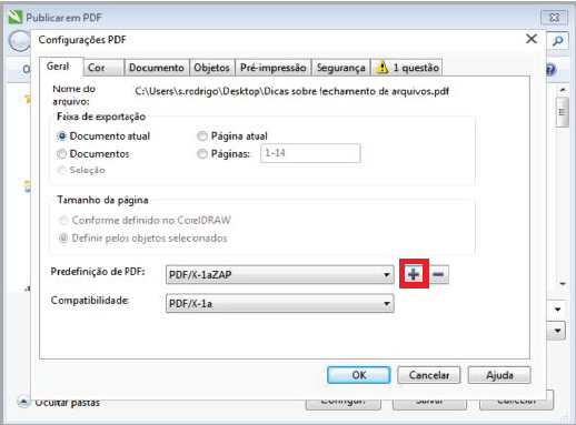 Na janela de "Configurações de PDF", na aba "Geral", clique no sinal de "+" para salvar o novo perfil